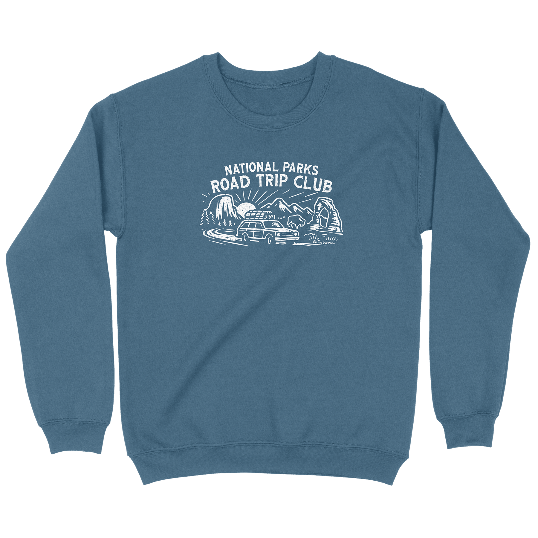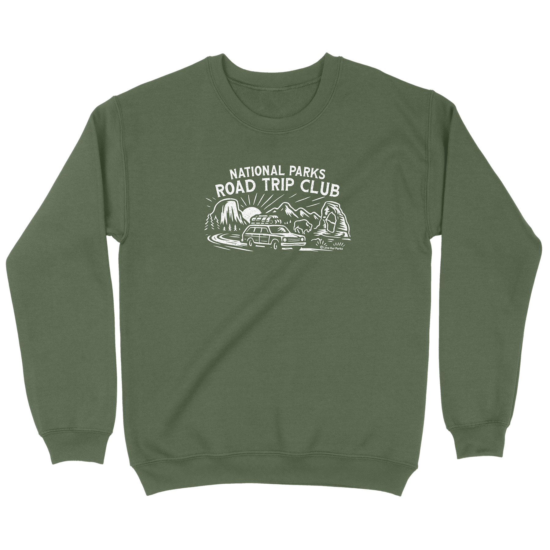Hit the open road in style with our cozy National Parks Road Trip Club Sweatshirt! Featuring a vintage station wagon cruising past mountains, bison, and winding roads, this design captures the freedom of exploring America’s wild places. Perfect for road trip enthusiasts and National Park lovers alike.