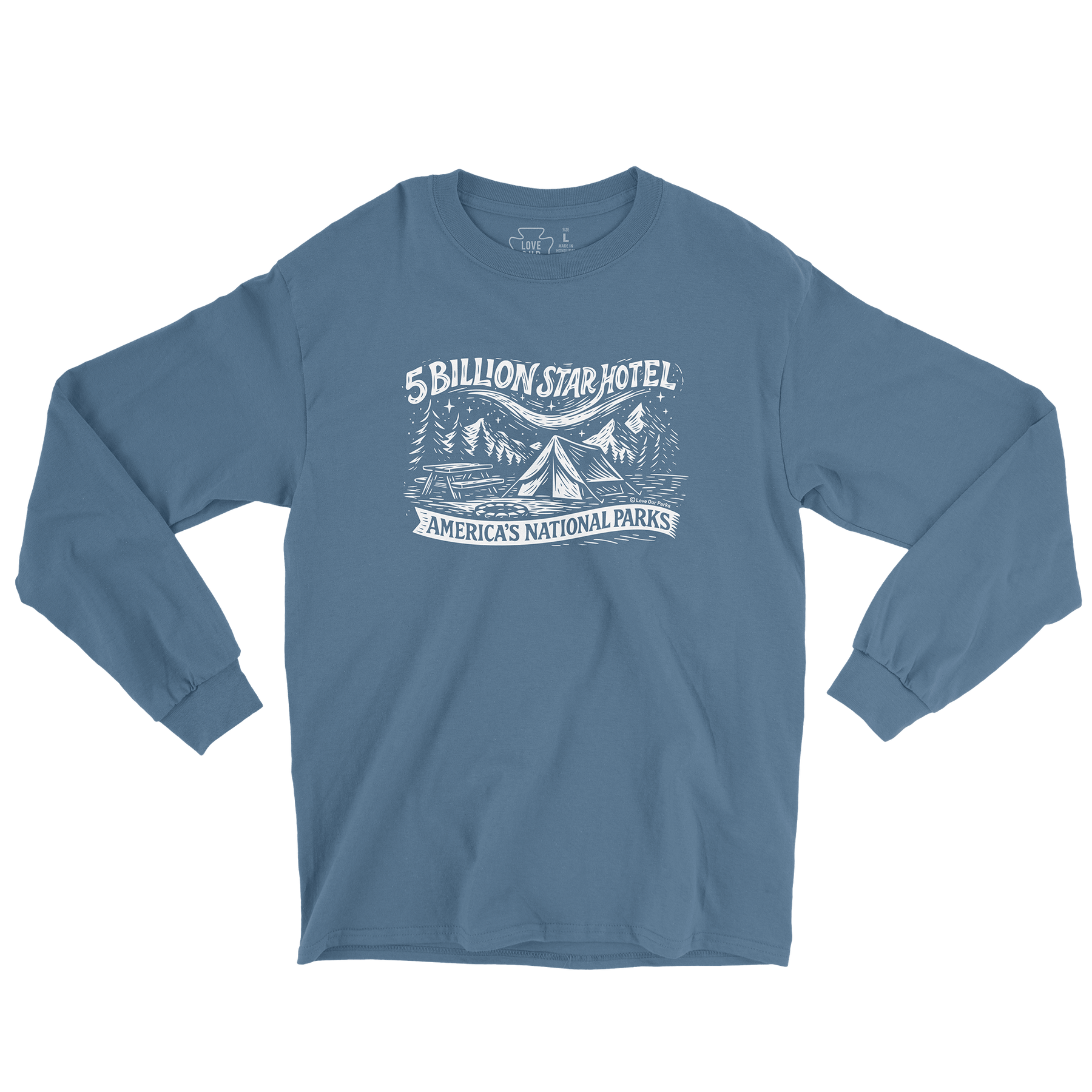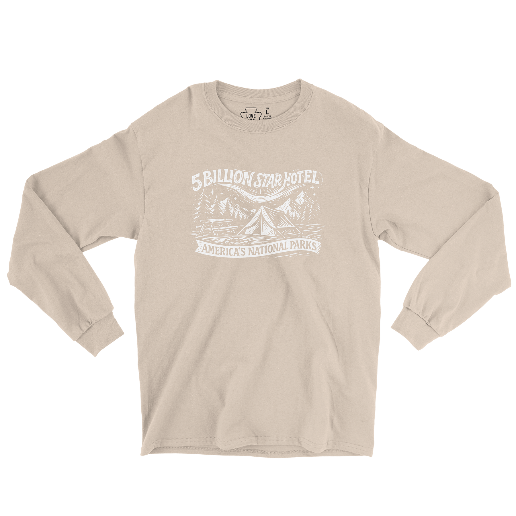 Skip the lobby and check into the best hotel on Earth, your very own 5-Billion Star Hotel! This long sleeve tee features a cozy tent, a crackling campfire, and towering pines beneath a glowing Milky Way sky. It’s perfect for anyone who believes the best nights are spent outdoors rather than indoors. Made from soft, comfortable 100% cotton, it’s ready for road trips, campgrounds, and every National Park on your bucket list.