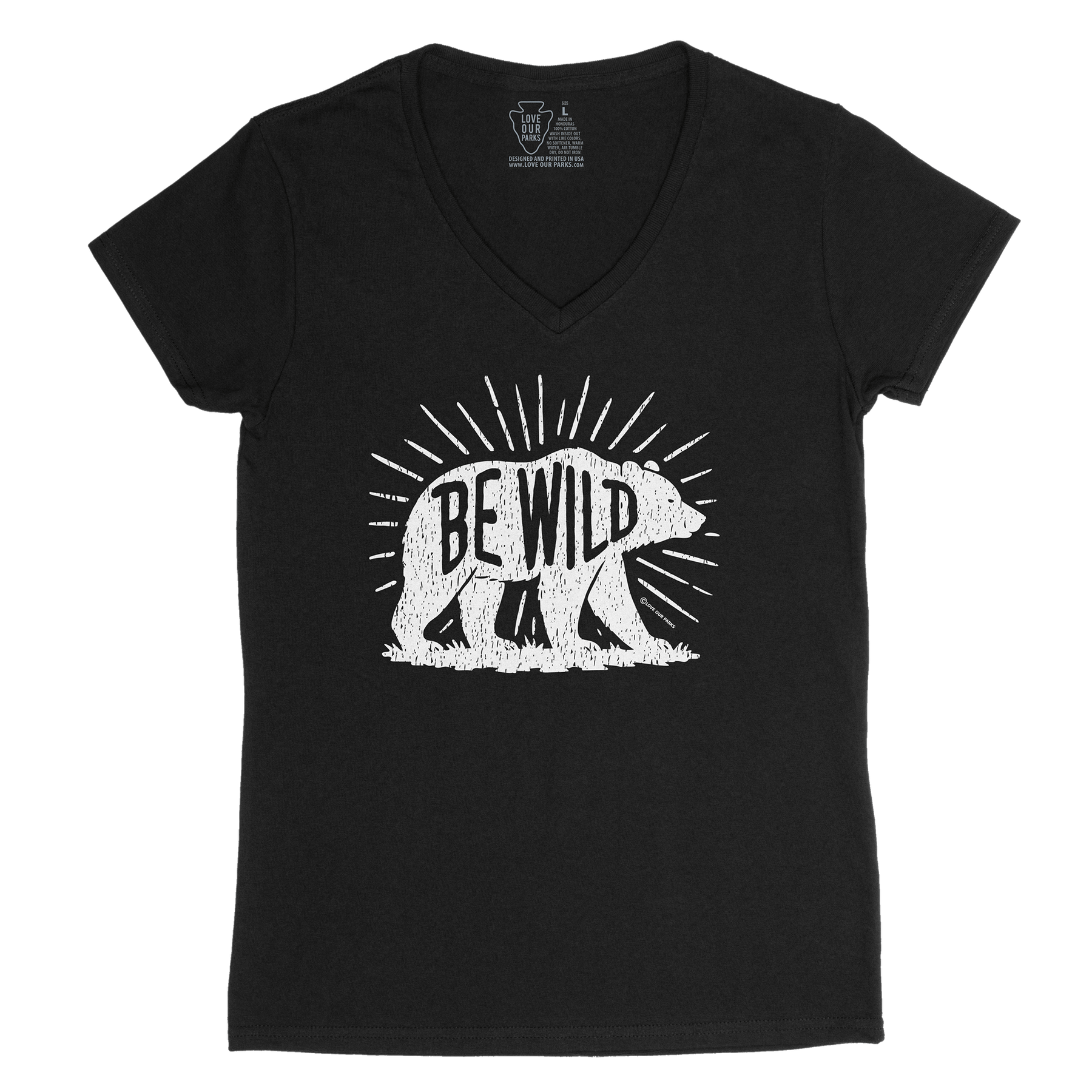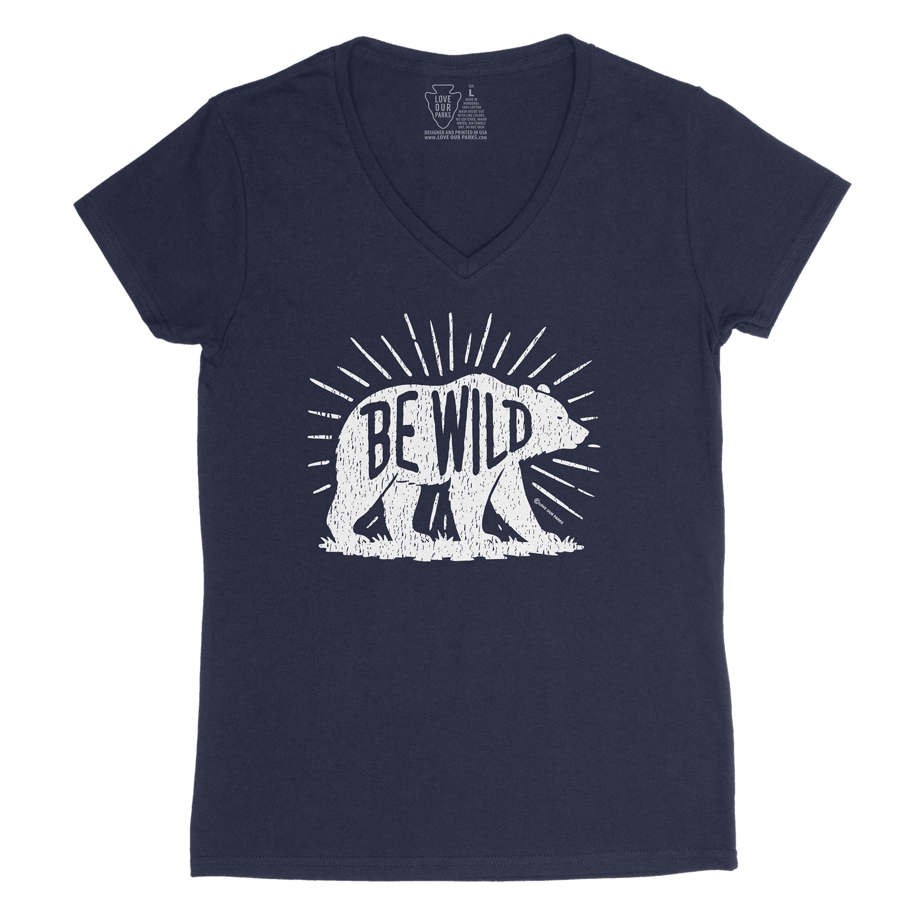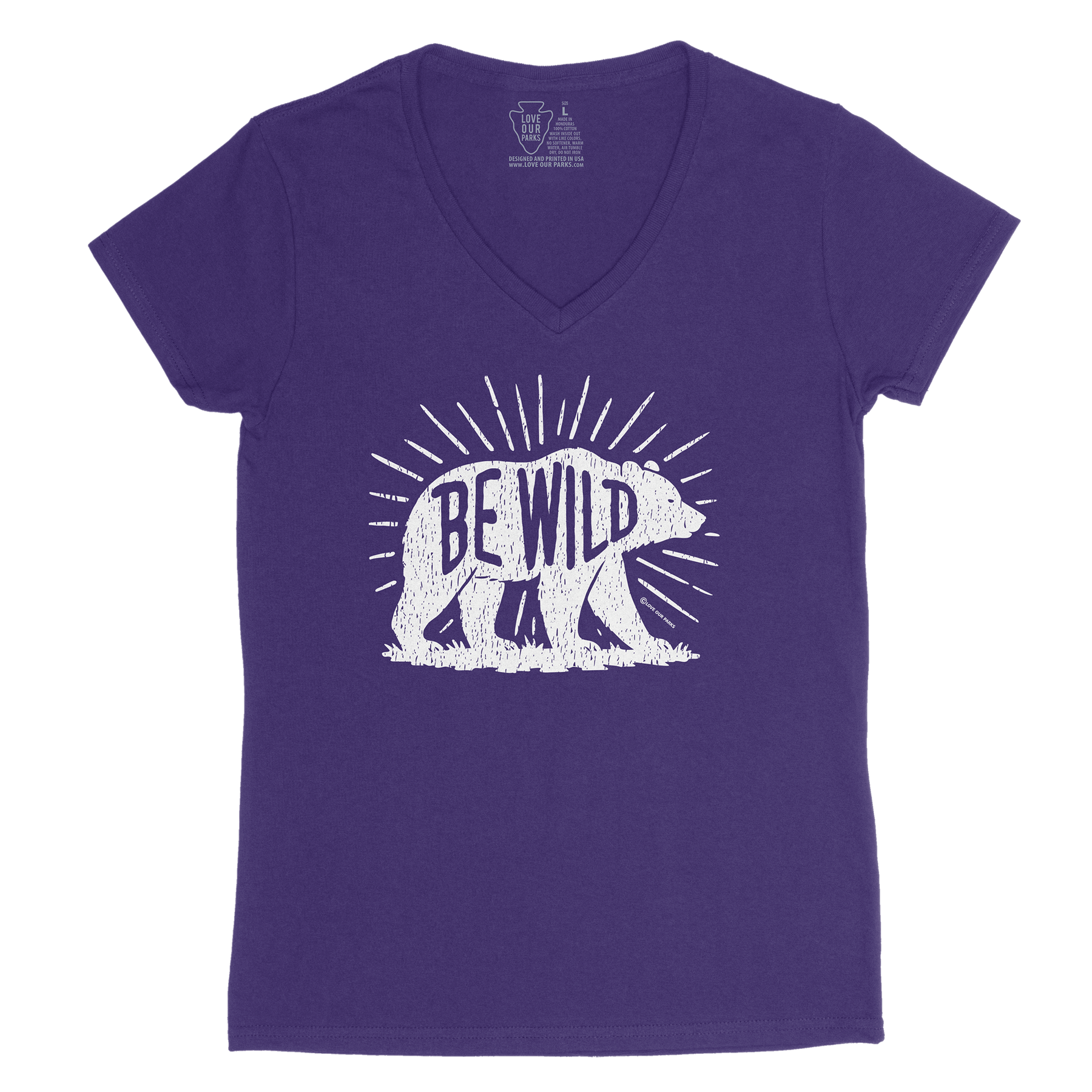 Channel rugged mountain energy with the Be Wild Bear women's v-neck tee. A powerful bear silhouette frames the “BE WILD” message, finished with vintage texture and radiant trail-sun rays. It’s a wearable reminder to take the steep path, chase the views, and respect the wildlife we share it with.