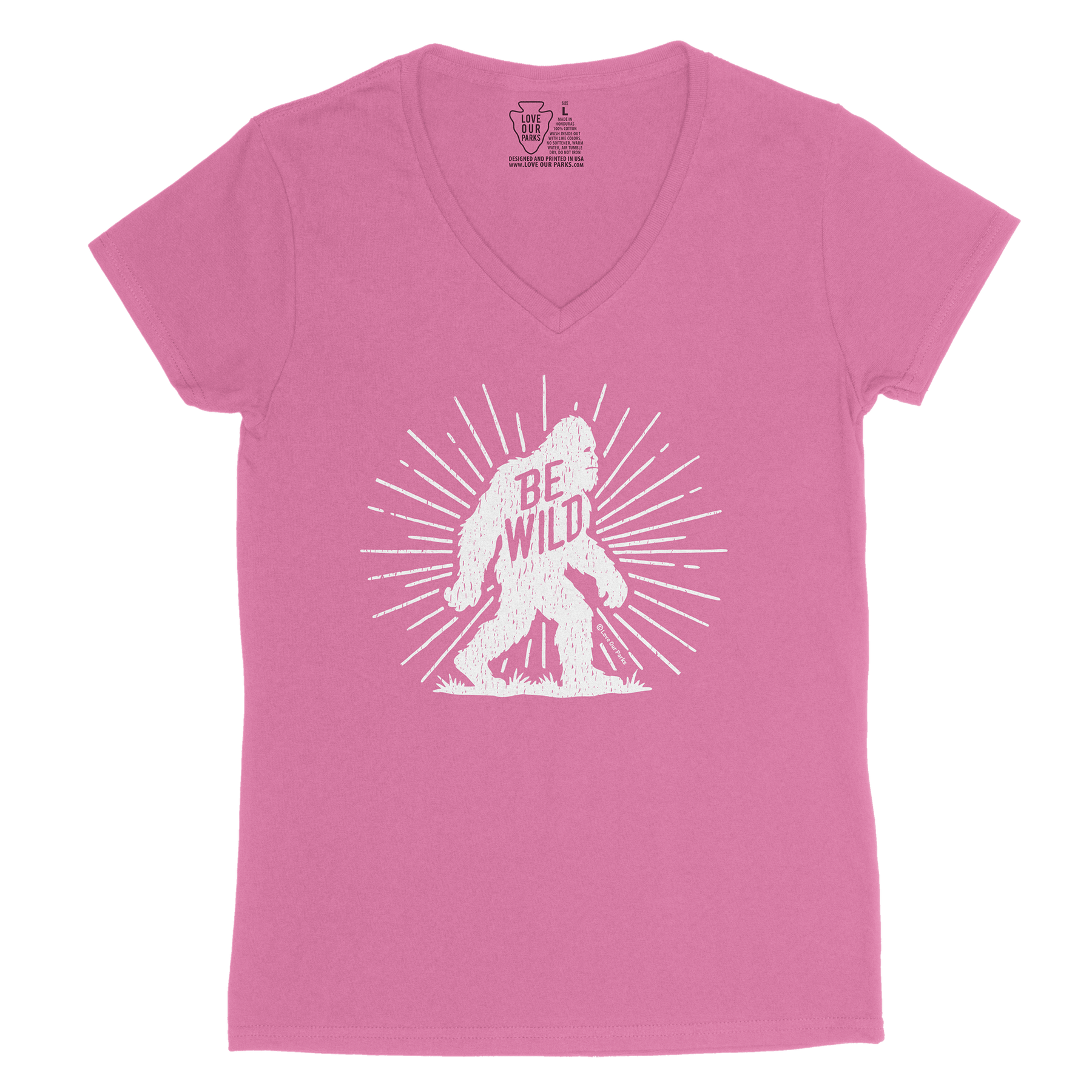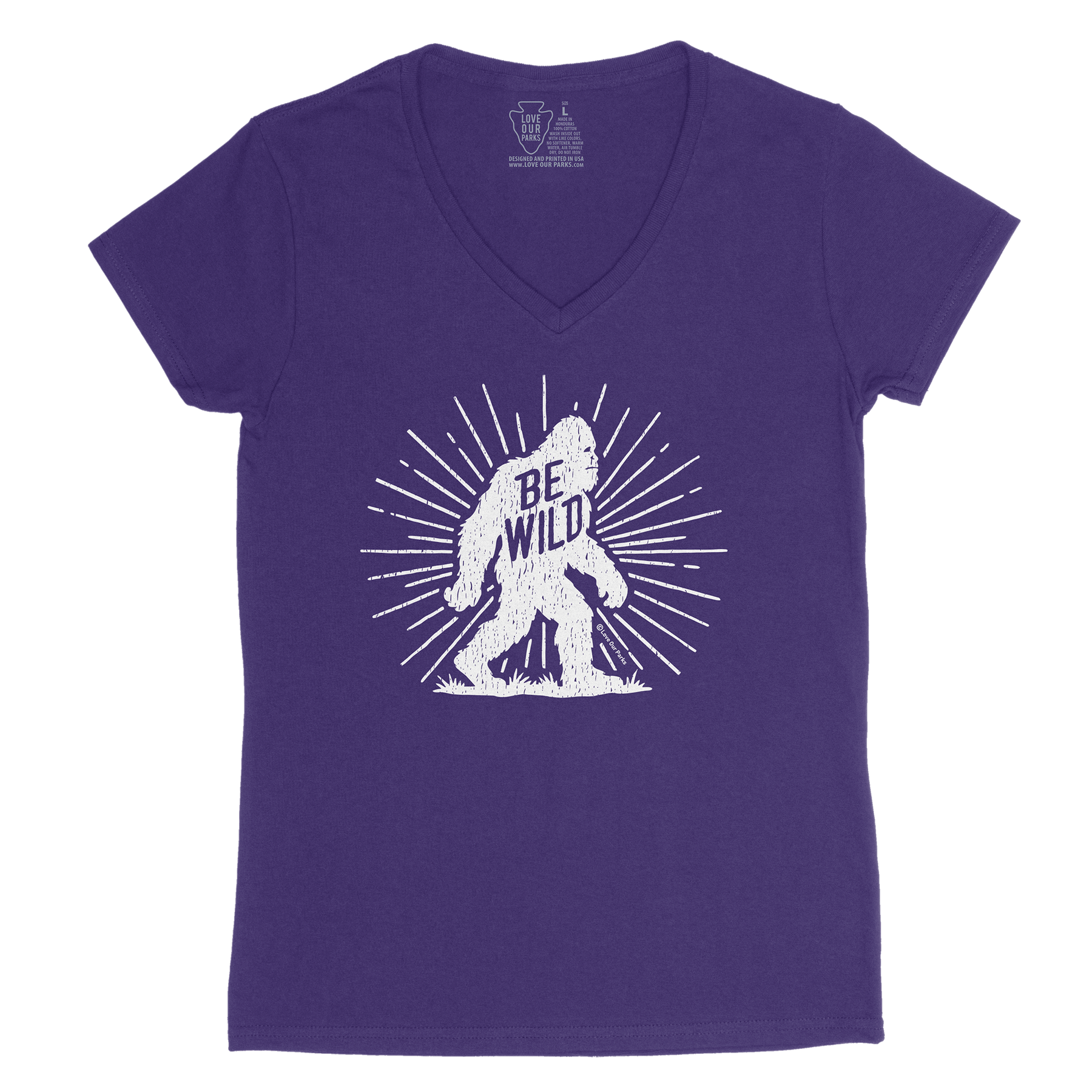 For the campers who swear they saw something move in the tree line, the Be Wild Bigfoot women's v-neck tee celebrates the legend of the backcountry. A bold Bigfoot silhouette strides across the design with a burst of rays and a worn-in, vintage look; perfect for nights around the campfire, early-morning trailheads, and swapping stories about what’s out there in the woods.