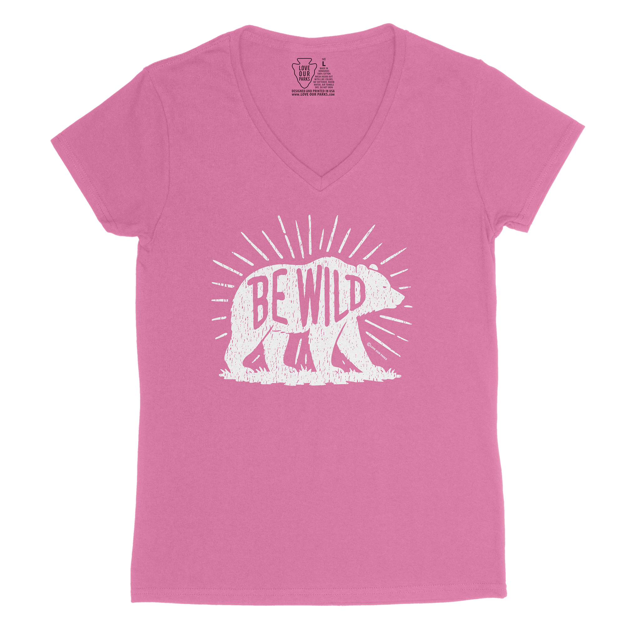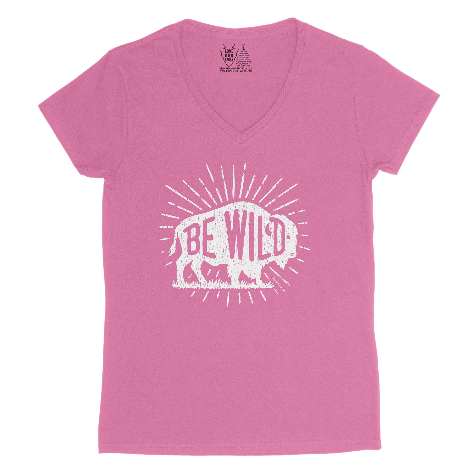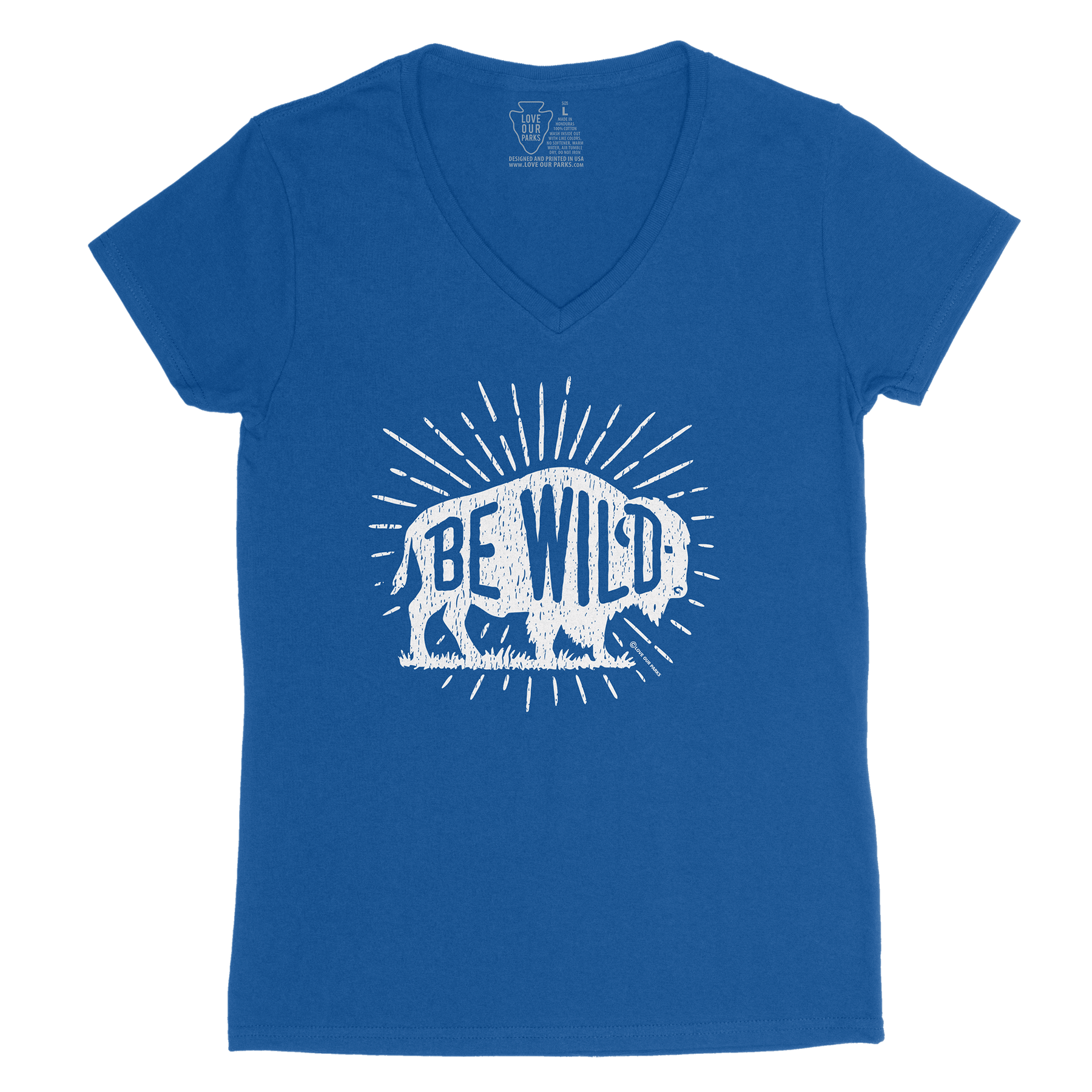 Pay tribute to the king of the prairie with our Be Wild Bison women's v-neck tee. Bold “BE WILD” lettering runs through a classic bison silhouette with hand-drawn distressing and sunburst rays—an ode to wide-open grasslands and big-sky freedom. Perfect for park days, road trips, and anyone who carries a little frontier spirit wherever they roam.