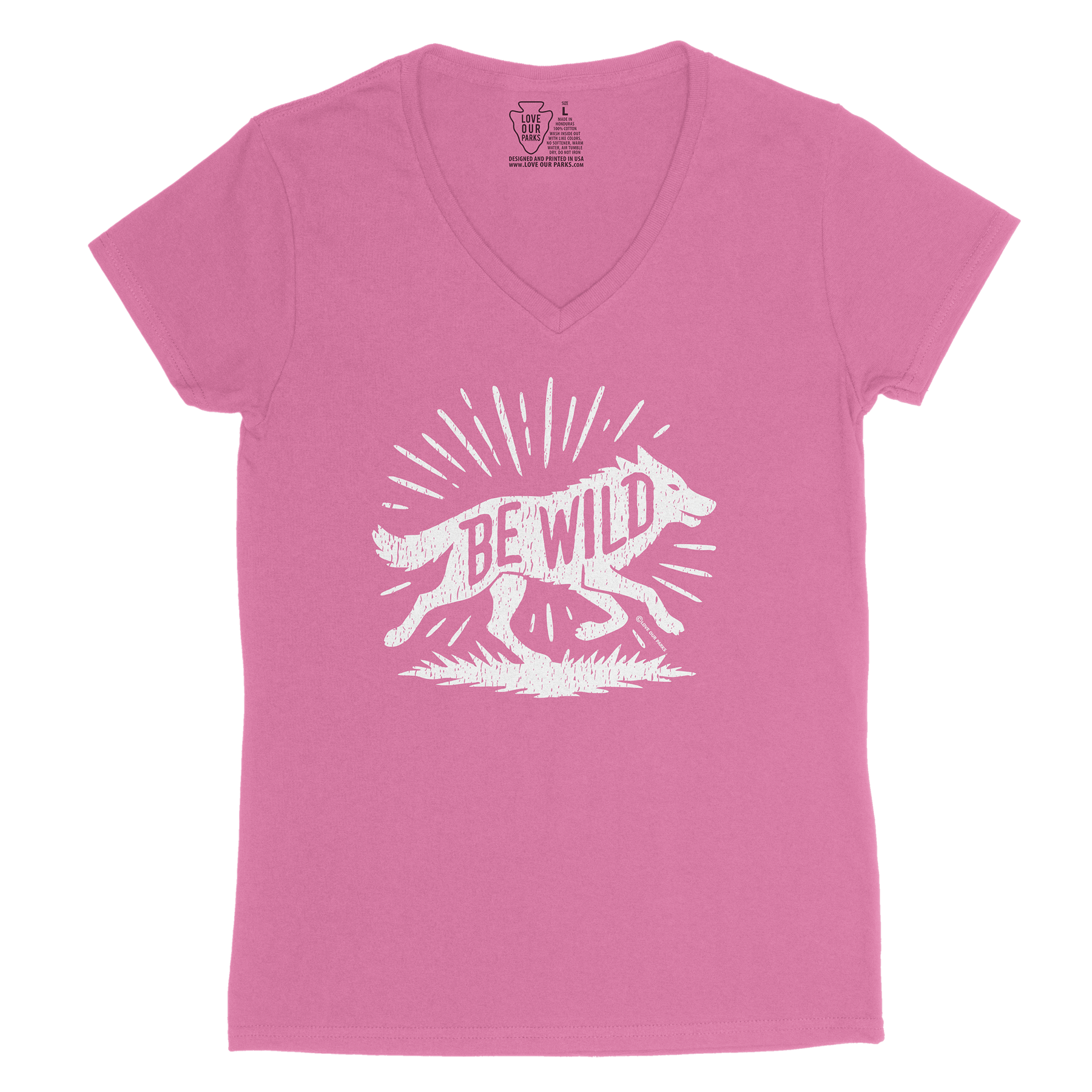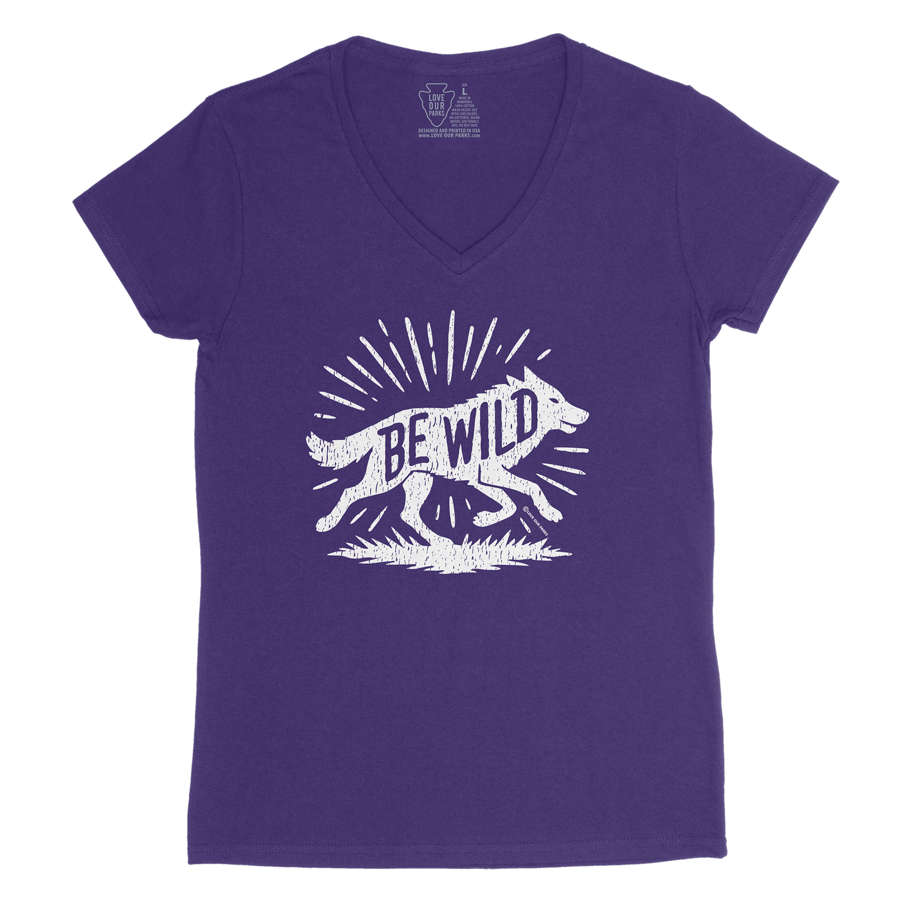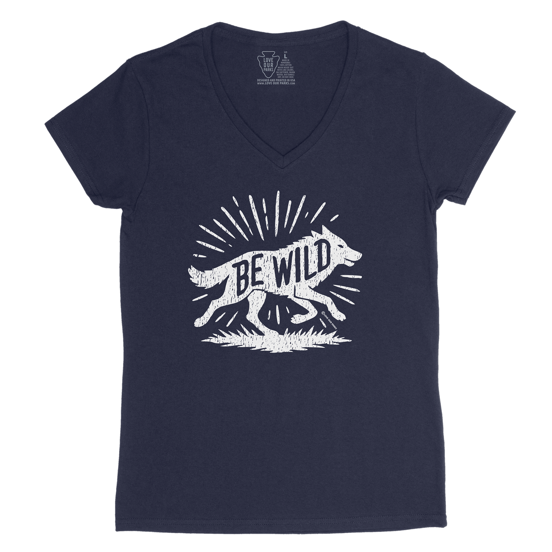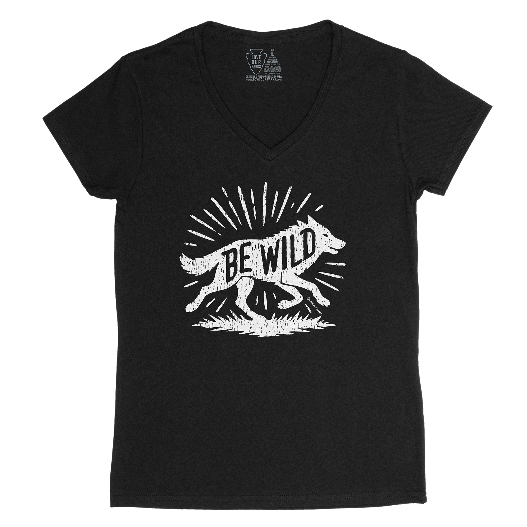 For the wanderers and wayfinders, our Be Wild Wolf v-neck tee runs with the spirit of the pack. A sleek wolf silhouette showcases the “BE WILD” message, surrounded by energetic sunbursts and a lived-in, vintage feel. Built for late-night campfires, early trail starts, and every wild moment in between.