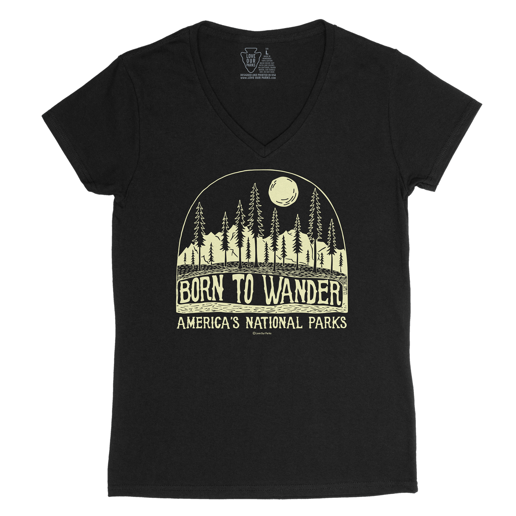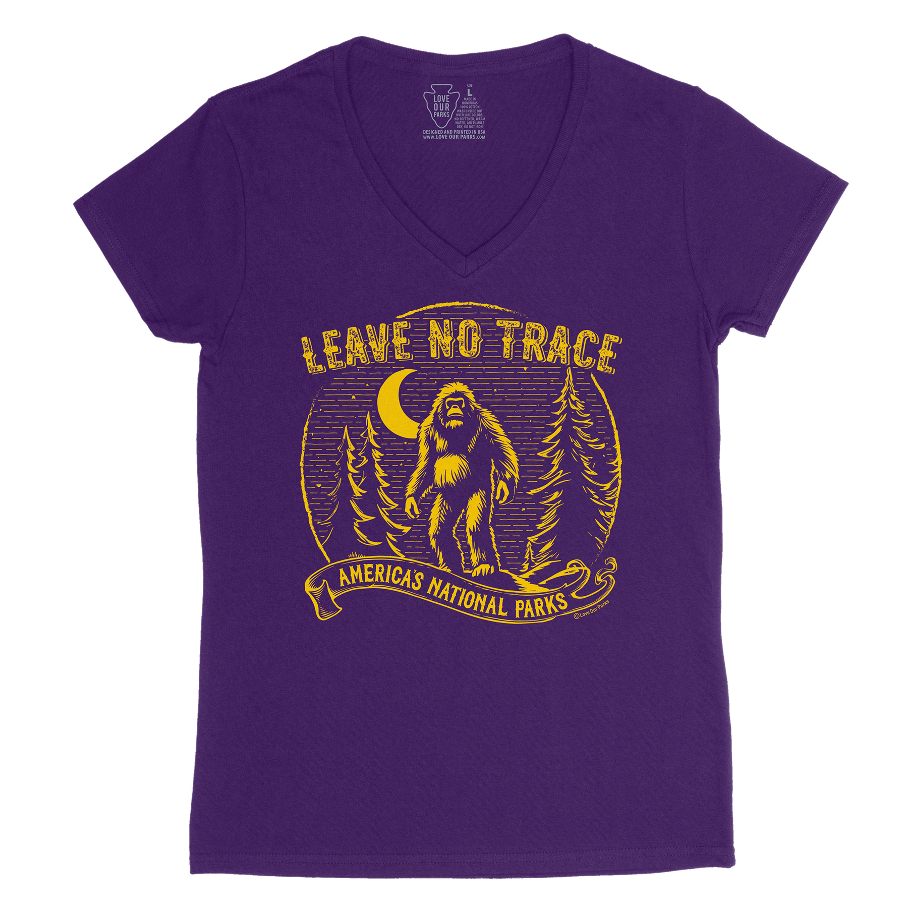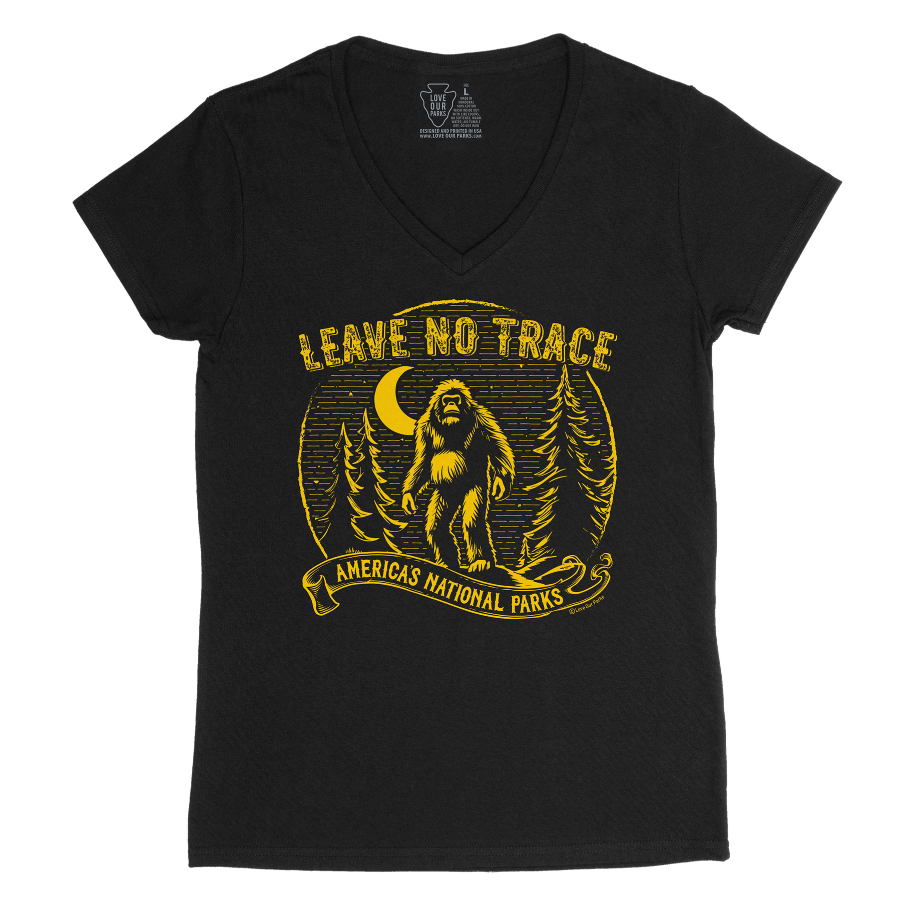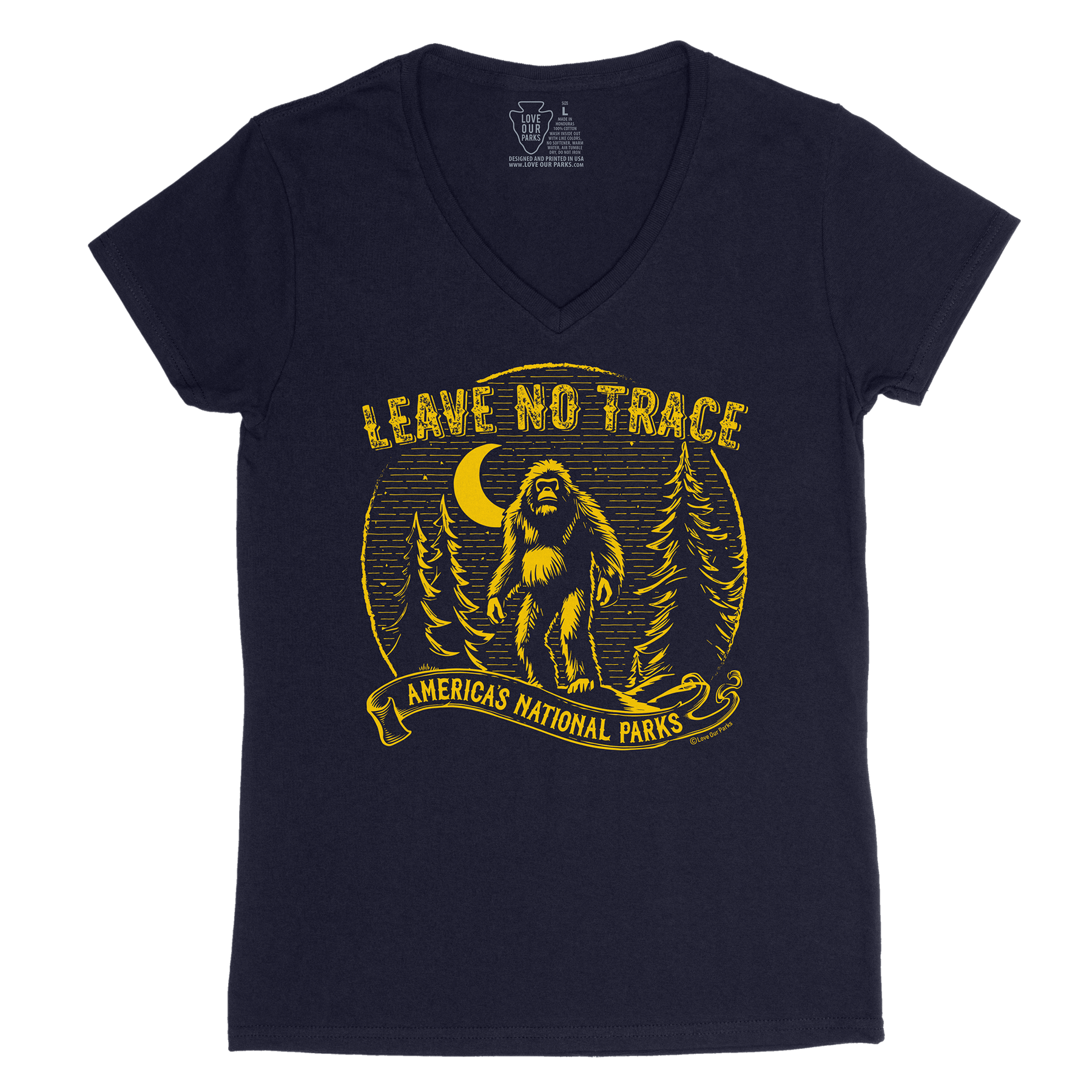 Embrace your love for nature with our Leave No Trace Bigfoot Women's V-Neck Tee. Made from 100% cotton, this tee features the iconic Bigfoot and the message "Leave No Trace - America's National Parks".