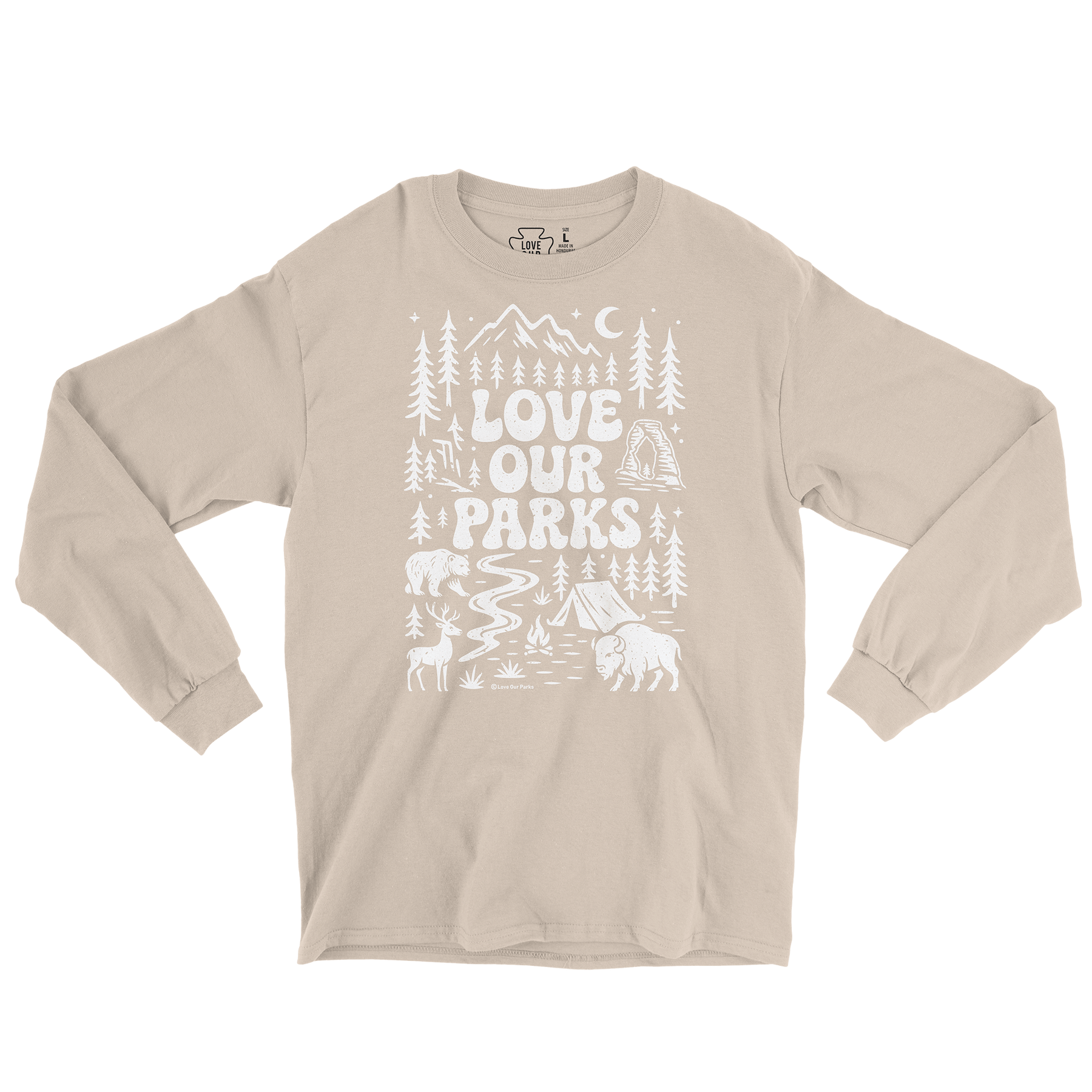Our Love Our Parks Wilderness long sleeve tee celebrates the wild and diverse nature of our National Parks. Mountains, pines, and native wildlife wrap around bold lettering, like a little tribute to every road trip, trailhead, and starry sky you keep coming back to.