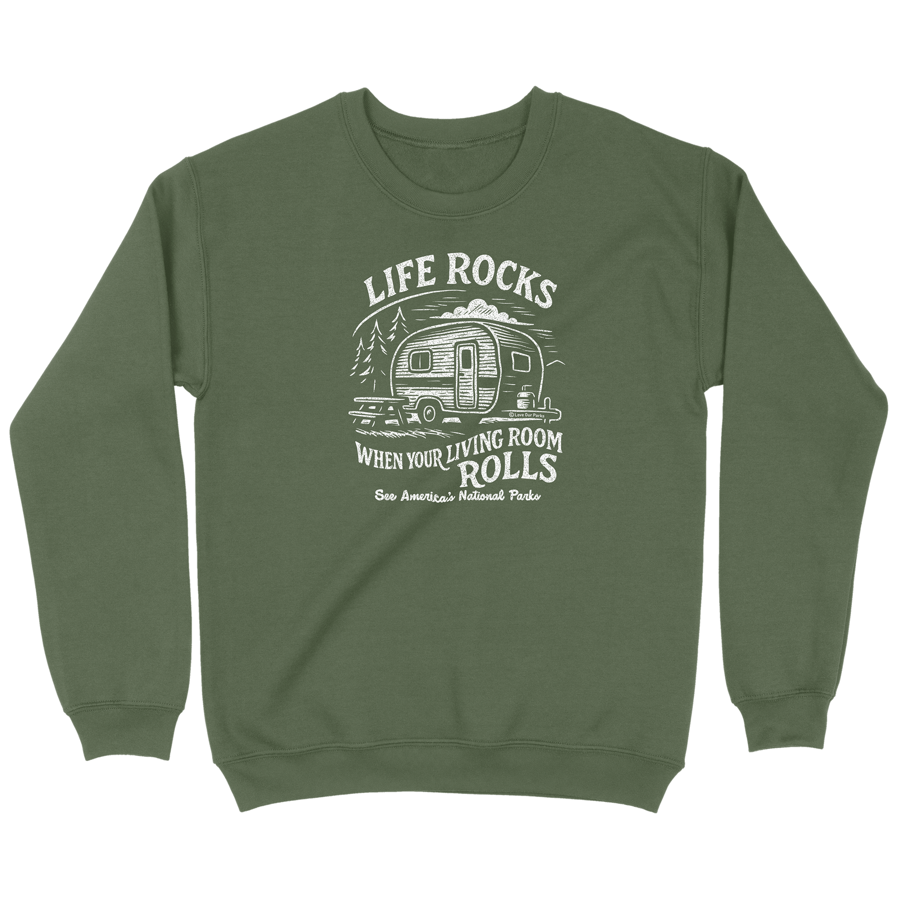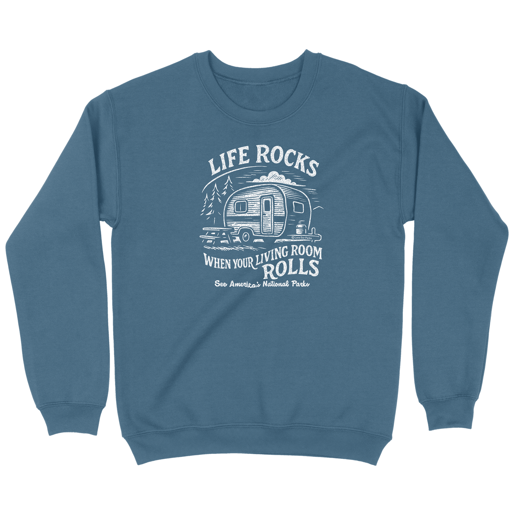 For those who feel most at home on the road, this sweatshirt is for you. Featuring a vintage camper design and the phrase “Life Rocks When Your Living Room Rolls,” it captures the freedom of life on wheels and the beauty of waking up somewhere new. Designed and printed in the USA, each tee supports the parks that make our adventures possible.