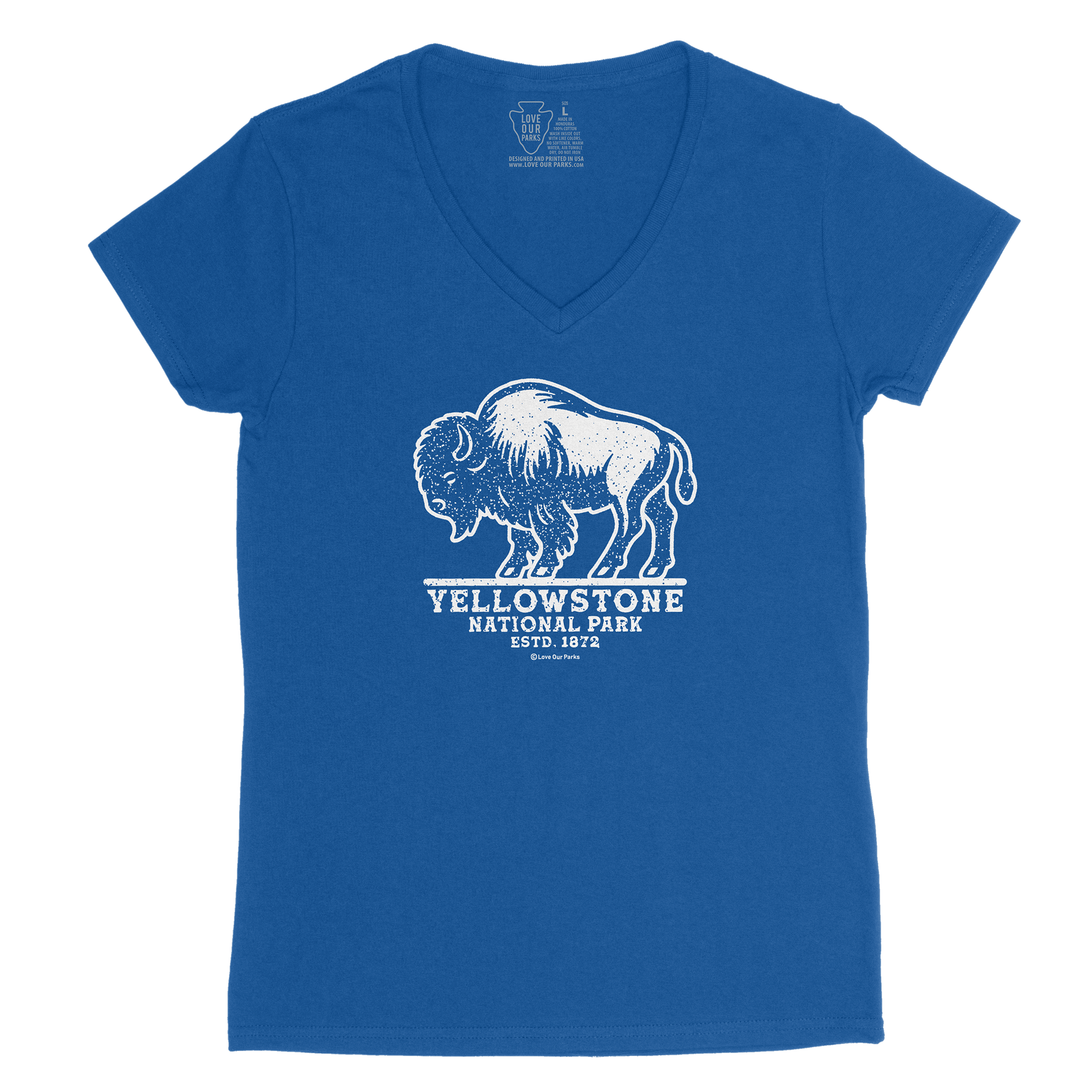 Hit the open road in style with our National Parks Road Trip Club Women's V-Neck Tee! This shirt features artwork of a vintage station wagon cruising past iconic National Park landmarks, including mountains, bison, and winding roads. The design captures the freedom and adventure of exploring America’s wild places. It's perfect for road trip enthusiasts, National Park lovers, and anyone who believes that the journey is just as memorable as the destination.