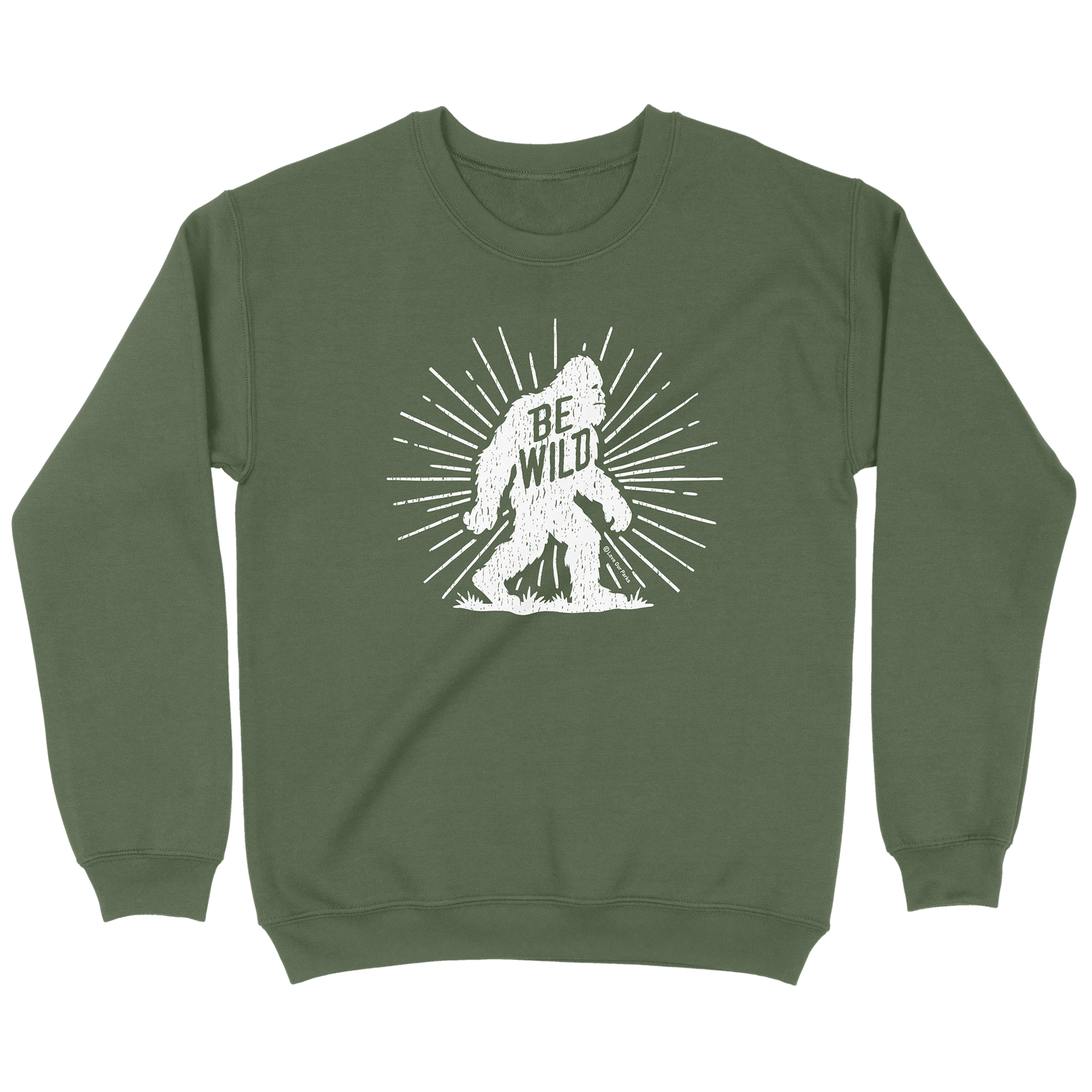 For the campers who swear they saw something move in the tree line, our Be Wild Bigfoot sweatshirt celebrates the legend of the backcountry. A bold Bigfoot silhouette strides across the design with a burst of rays and a worn-in, vintage look; perfect for nights around the campfire, early-morning trailheads, and swapping stories about what’s out there in the woods.